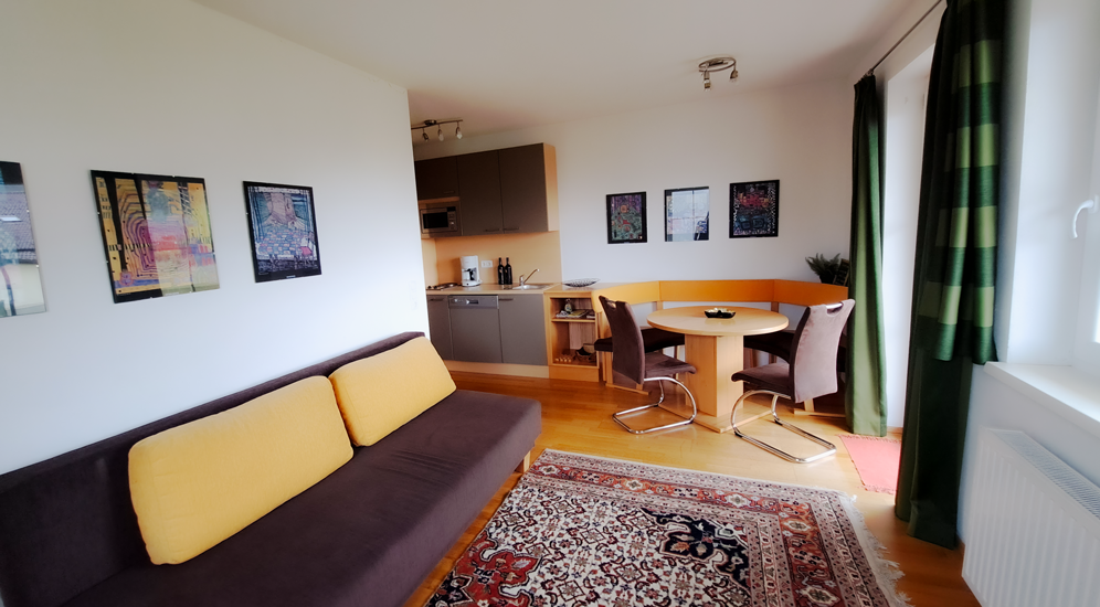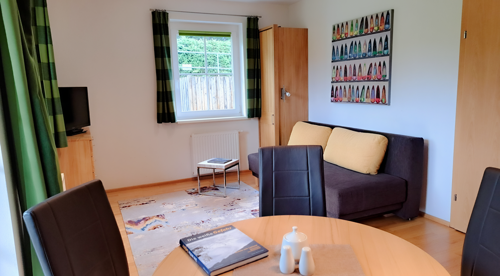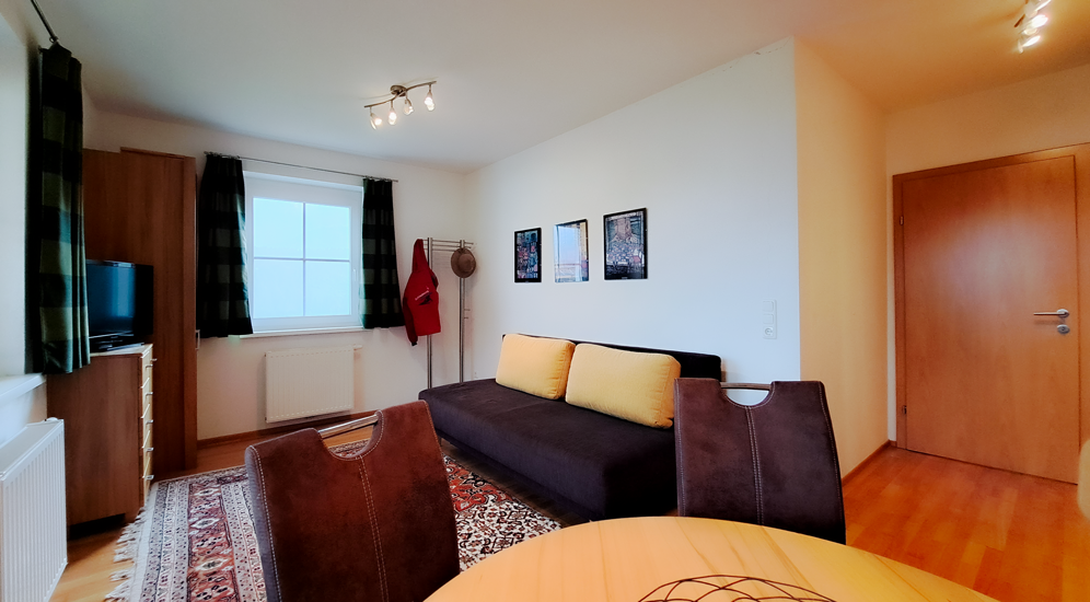 • Wohnzimmer mit großer Essgruppe, ausziehbarer Doppelcouch und Kabel-TV mit 32“ LCD FlatScreen
